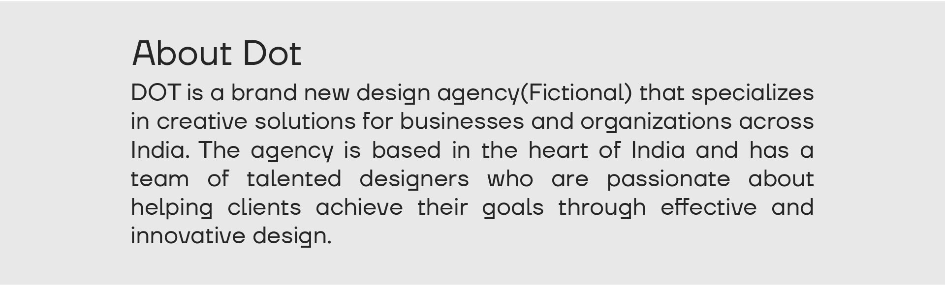 DOT is a brand new design agency(Fictional) that specializes in creative solutions for businesses and organizations across India. The agency is based in the heart of India and has a team of talented designers who are passionate about helping clients achieve their goals through effective and innovative design.